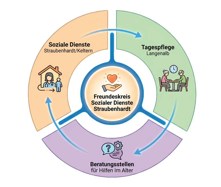 Gemeinsam für ein starkes Miteinander in Straubenhardt: Wir vom Freundeskreis setzen uns für ältere, kranke und hilfsbedürftige Menschen ein, indem wir die Sozialen Dienste Straubenhardt/Keltern, die Tagespflege in Langenalb und die Beratungsstelle für Hilfen im Alter unterstützen. Mit Infoabenden zu Gesundheit und Alltag sorgen wir dafür, dass jeder weiß, wie und wo man in der Gemeinde Unterstützung erhält – damit alle mitten im Leben bleiben können.